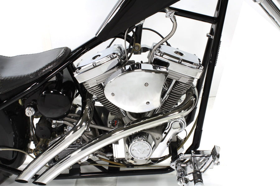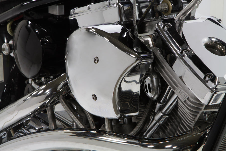 Scoop air cleaner cover is chrome with shorter mount boss in side cover for S&S E models and air cleaner only. Cover only is constructed of steel.