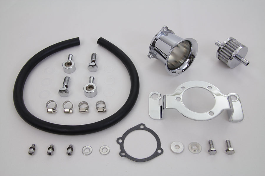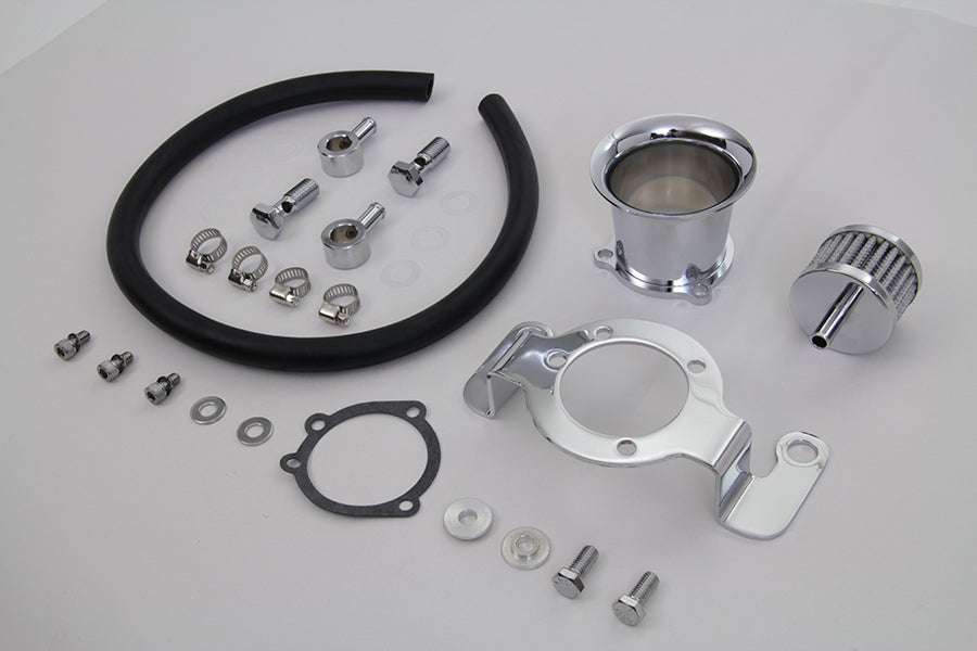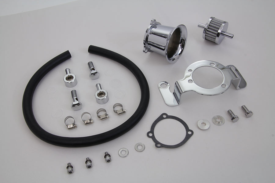 Chrome velocity stack kit includes 2-1/2 chrome stack chrome support bracket and breather kit with black hose.
