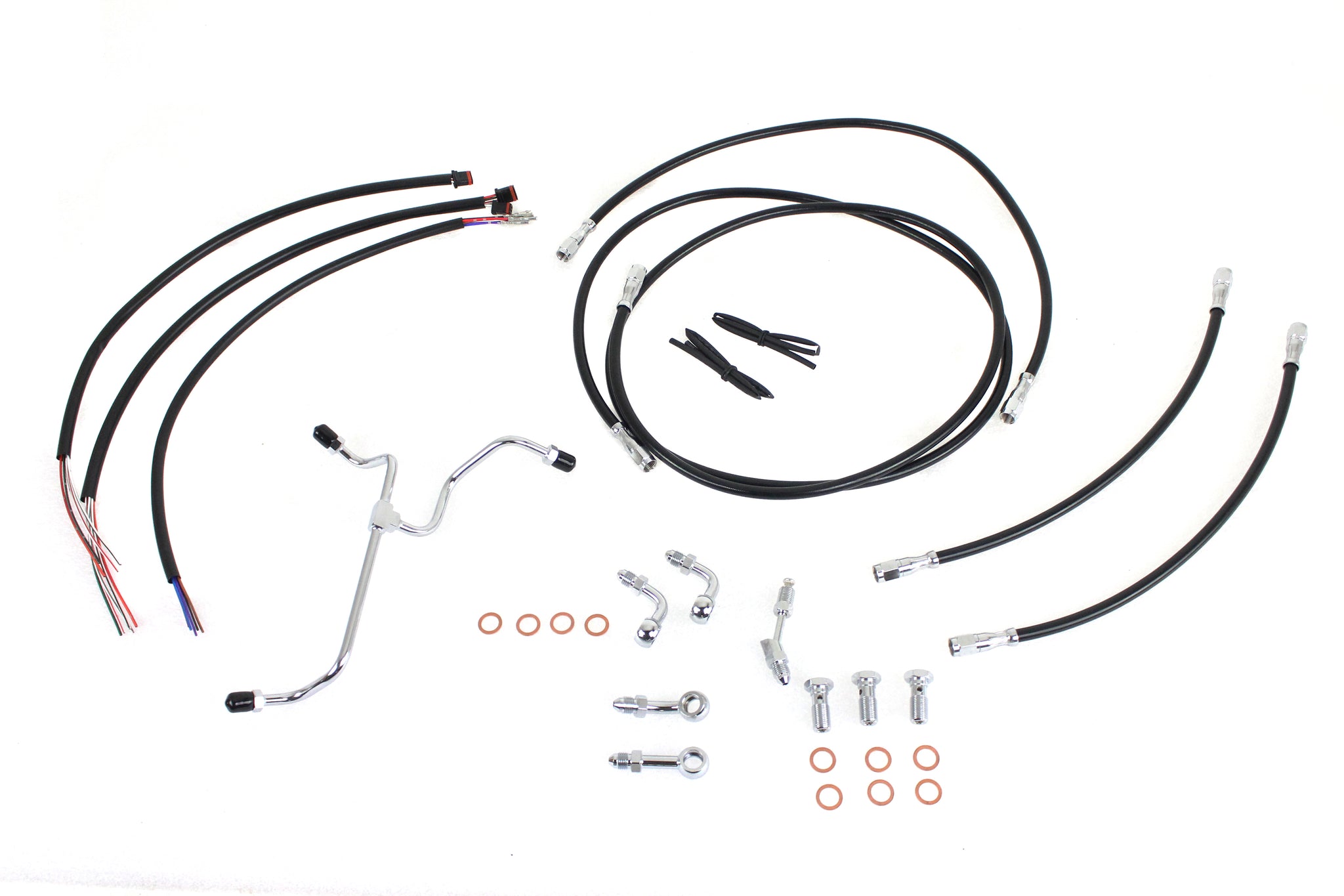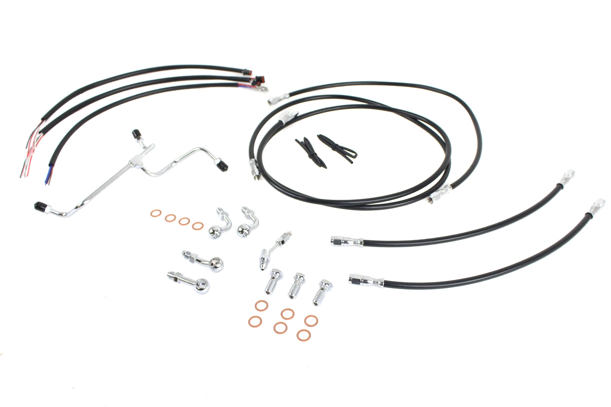 Handlebar cable and wiring line kit is for the complete installation on 12 -14 ape hangers. Kit includes extended clutch cable or clutch line extended throttle and idle cable as required and all necessary wiring extensions. Dresser kits reuse stock throttle-by-wire harnesses. *NOTE: Kits are based on using 2 riser with ape hanger style handlebars. *NOTE: Does not include brake line.