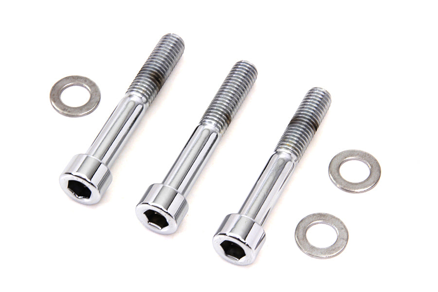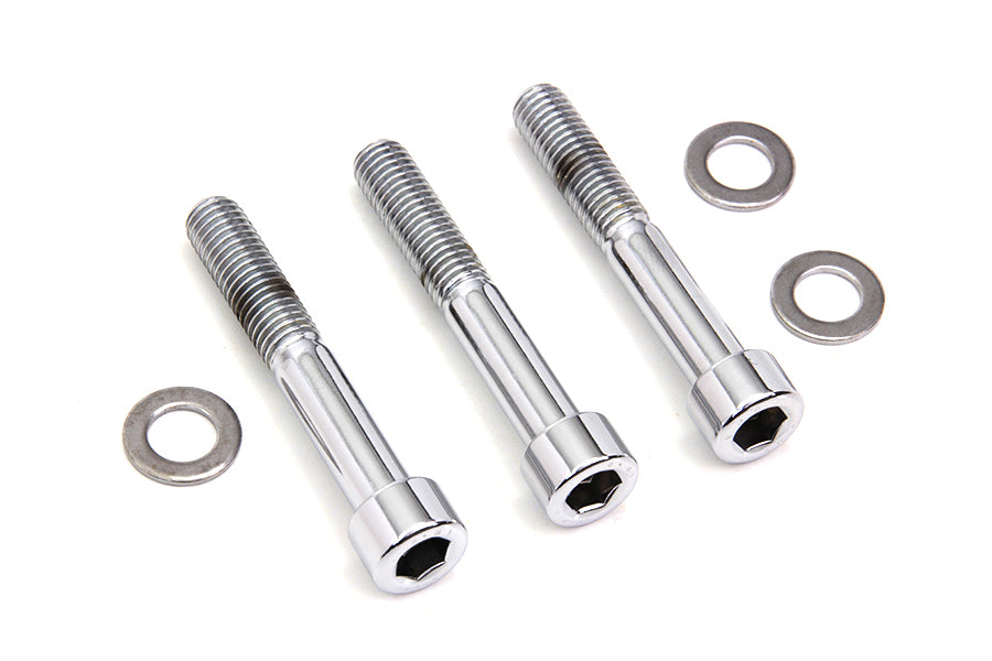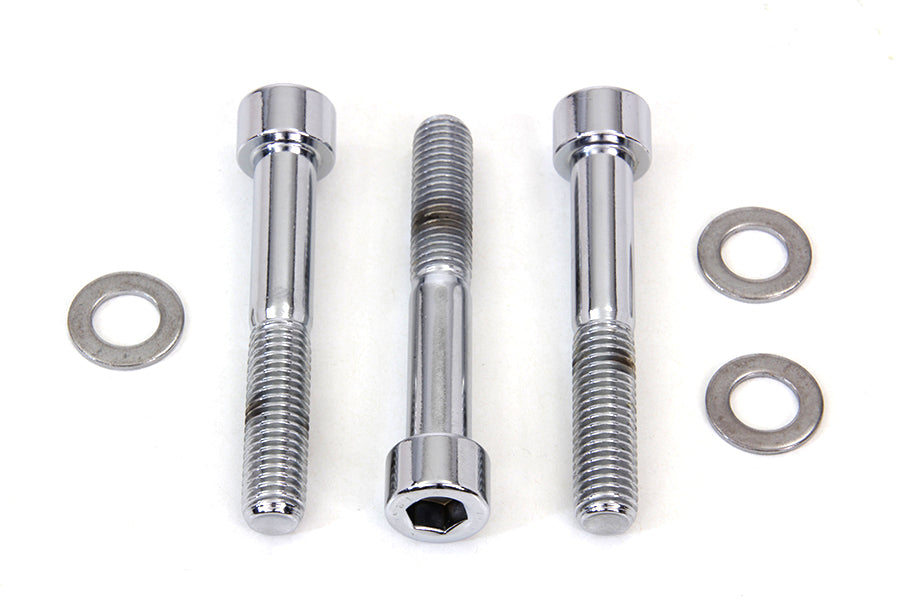 Chrome rear brake caliper mount kit with allen bolts and washers to mount rear brake caliper.