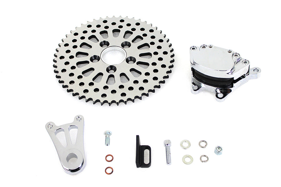 Kit includes an Edart rear bracket and a 10 polished drilled spoke style 51 tooth disc sprocket. Direct bolt on kit provides a clean rigid application and includes the weld-on tab. Right or left side drive mounted.