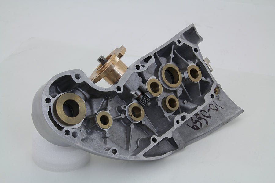 Polished aluminum cam cover include bushings for cams and have a cutout for the starter motor. Lower mount hole is slotted for 1971-1973 models. Cover is for electric start models. The top threaded hole measures 5/8 X 11. *NOTE: Lower edge has welding marks and pits where cross fit for the oil passage is closed for oil circulation. These are part of the manufactureing process and not a defect in the cover.