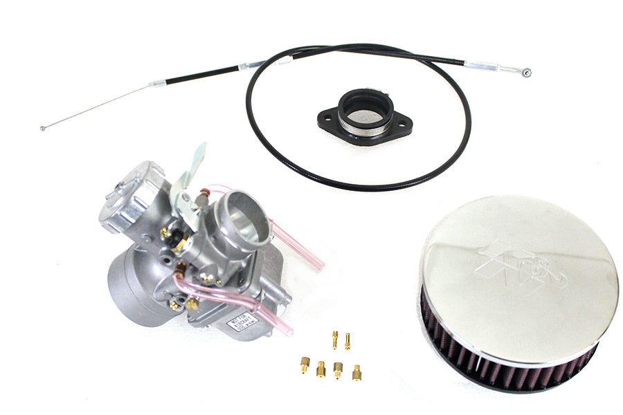 Mikuni 38mm carburetor kit includes air cleaner carburetor manifold adapter hose clamps main and pilot jet assortment and throttle cable. Carburetor has a #330 main jet #30 pilot jet and a #166 needle jet installed.