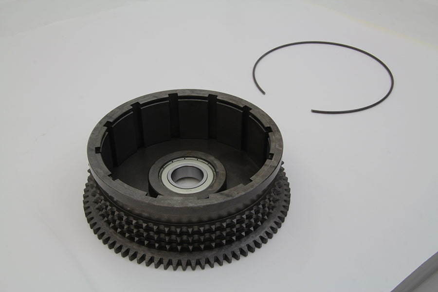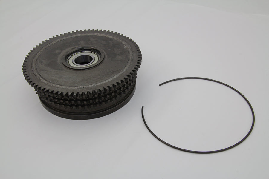Clutch drum sprocket assembly with ring gear. Clutch drum includes ring gear that is welded on and bearing and snap ring installed.