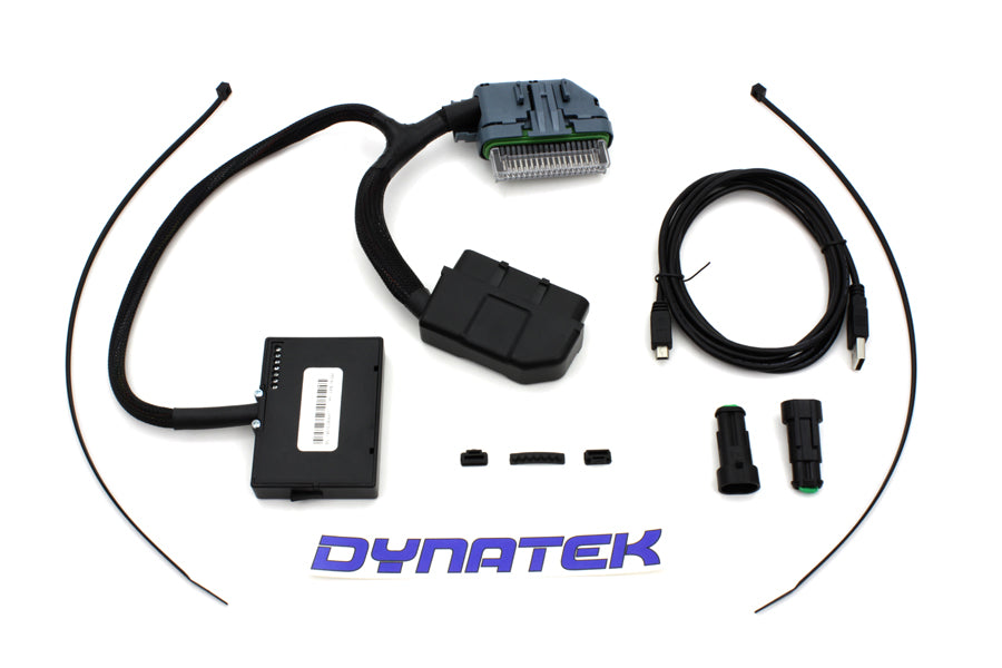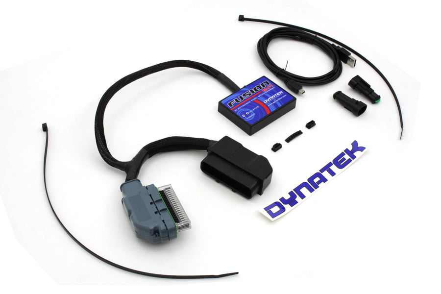 Dyna Fusion EFI module with fuel and ignition control is available for most models. The new Dynatek Fusion EFI bases fuel adjustments on input from RPM and throttle positions. Fuel delivery and spark advance adjustments can now be made with the Dynatek Fusion module. The Fusion EFI has 250 RPM resolution and 10 throttle position columns giving you up to 640 individual mapping points for fuel and an equal amount for ignition timing. This is the kind of point specific adjustability that is necessary with today's bikes and the parts that are available for them. This module features individual cylinder and gear position mapping a built in two position map switching function warm up fuel adjustments based on engine temperature an enhanced accel pump utility and is USB powered from computer. It also allows +/- 20 degrees of timing adjustments per cylinder or per gear. *NOTE: Not for sale in California.