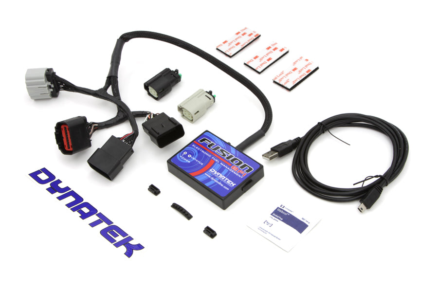 Dyna Fusion EFI module with fuel and ignition control is available for most models. The new Dynatek Fusion EFI bases fuel adjustments on input from RPM and throttle positions. Fuel delivery and spark advance adjustments can now be made with the Dynatek Fusion module. The Fusion EFI has 250 RPM resolution and 10 throttle position columns giving you up to 640 individual mapping points for fuel and an equal amount for ignition timing. This is the kind of point specific adjustability that is necessary with today's bikes and the parts that are available for them. This module features individual cylinder and gear position mapping a built in two position map switching function warm up fuel adjustments based on engine temperature an enhanced accel pump utility and is USB powered from computer. It also allows +/- 20 degrees of timing adjustments per cylinder or per gear. *NOTE: Not for sale in California.
