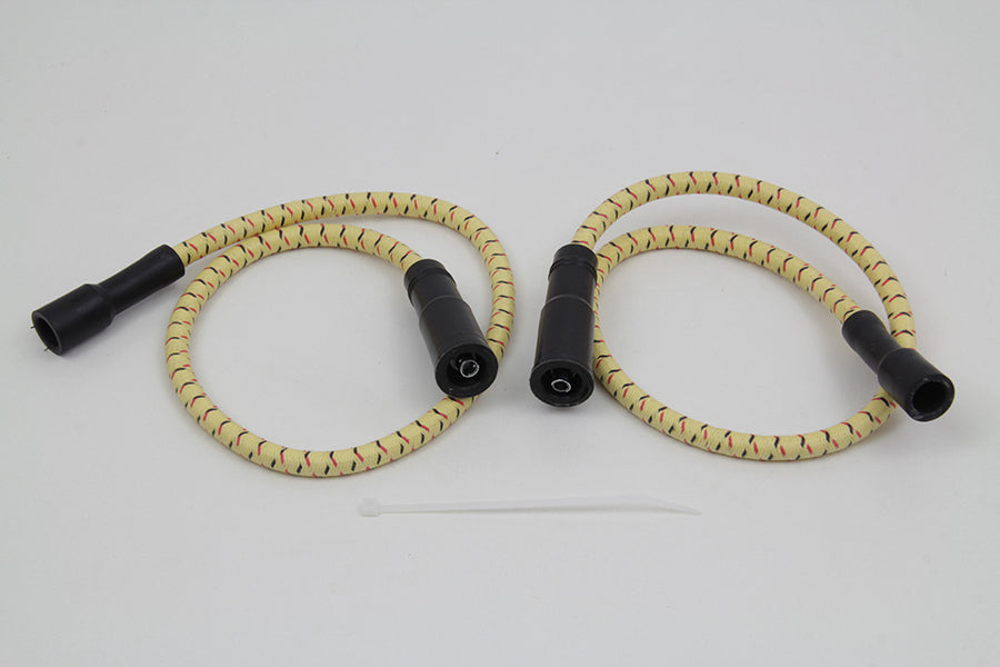 Sumax spark plug wire set is yellow with black & red tracer. A combination Kevlar Helically Spiral Wound Core at 350 ohm per foot resistance delivers greater spark energy while improving power idle and fuel efficiency. Cloth jacket is rated at 450°F and resists heat oil and abrasion. These wires will work on all models with point or electronic ignitions. Set includes two 21-1/2 lead with 180° plug boot and 180° coil boots.