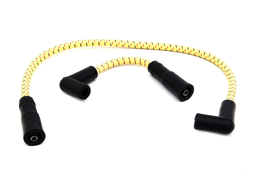 Sumax spark plug wire set is yellow with a black and red tracer. A combination Kevlar Helically Spiral Wound Core at 350 ohm per foot resistance delivers greater spark energy while improving power idle and fuel efficiency. Cloth jacket is rated at 450°F and resists heat oil and abrasion. These wires will work on all models with point or electronic ignitions. Set includes 19 & 17 leads with 90° plug boots and 180° coil boots.