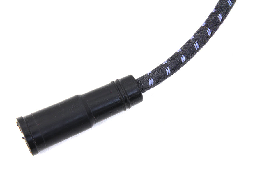 Sumax spark plug wire set is black w/ blue tracer. A combination Kevlar Helically Spiral Wound Core at 350 ohm per foot resistance delivers greater spark energy while improving power idle and fuel efficiency. Cloth jacket is rated at 450°F and resists heat oil and abrasion. These wires will work on all models with point or electronic ignitions. Set includes 21-1/2 lead with 180° plug boot & 180° coil boot as well as a 9 lead with 180° plug boot & 90° coil boot.