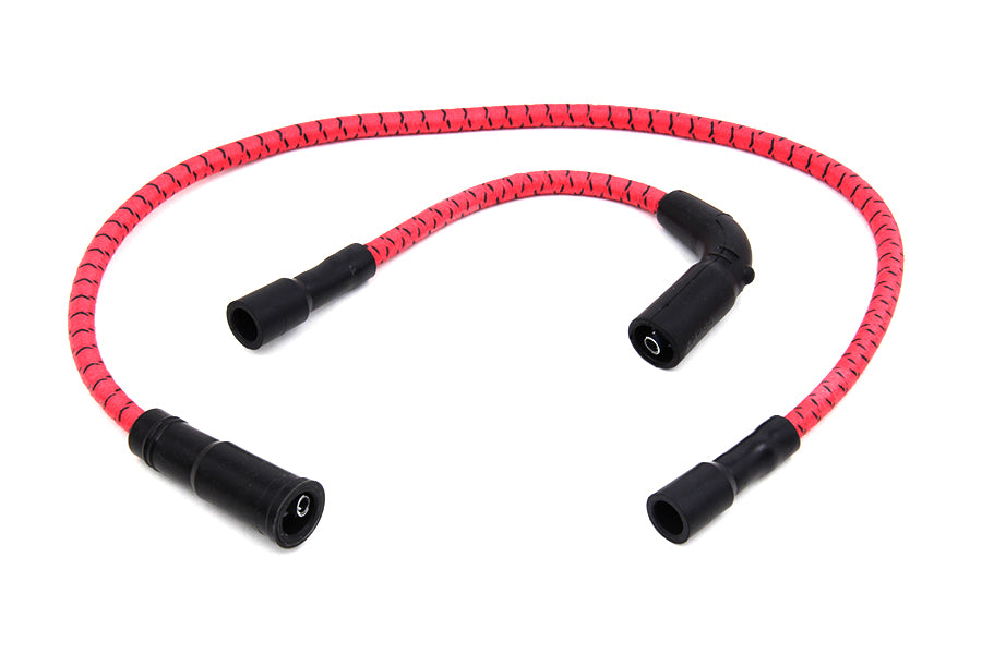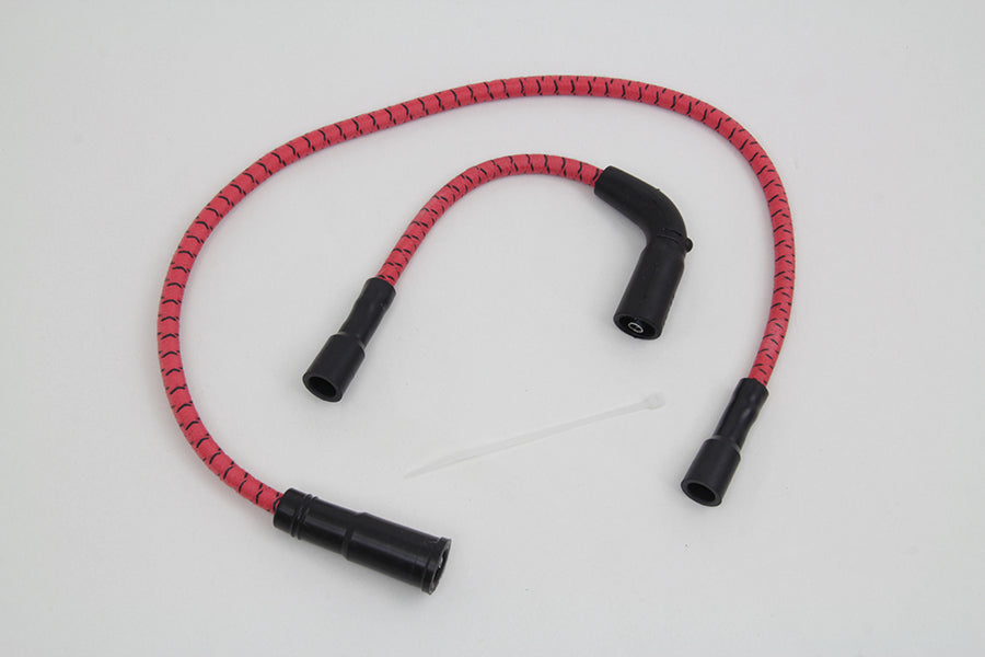 Sumax spark plug wire set is red w/ black tracer. A combination Kevlar Helically Spiral Wound Core at 350 ohm per foot resistance delivers greater spark energy while improving power idle and fuel efficiency. Cloth jacket is rated at 450°F and resists heat oil and abrasion. These wires will work on all models with point or electronic ignitions. Set includes 21-1/2 lead with 180° plug boot & 180° coil boot as well as a 9 lead with 180° plug boot & 90° coil boot.