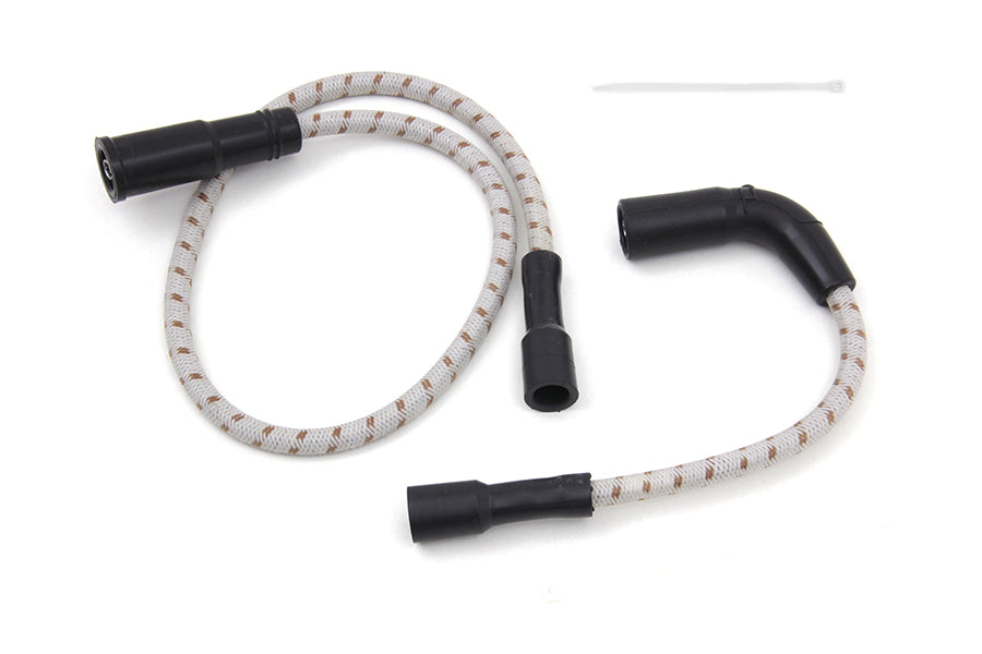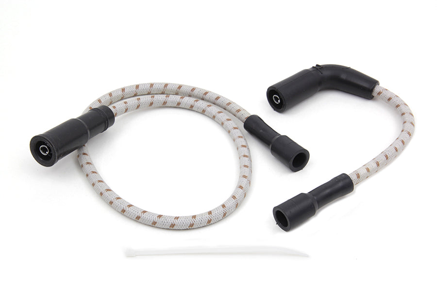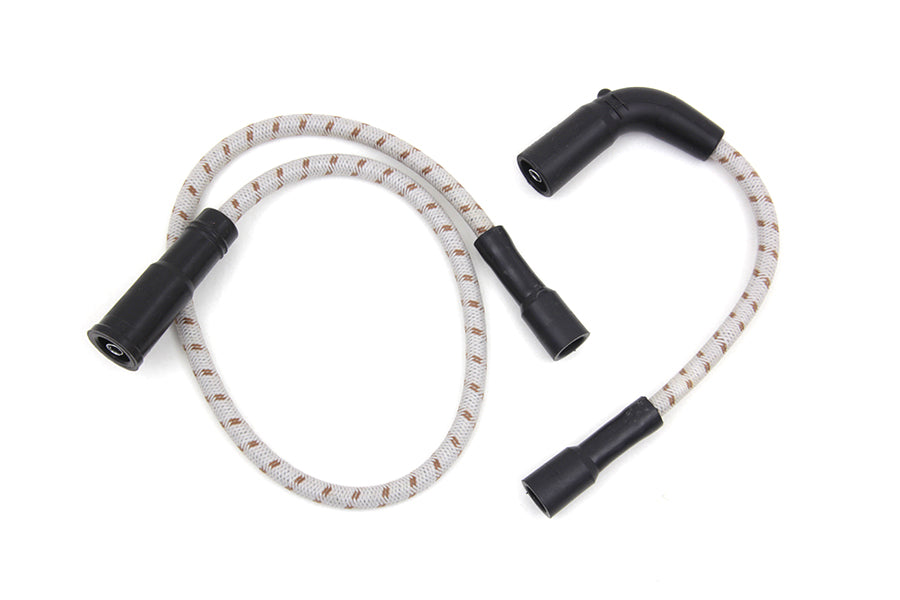 Sumax spark plug wire set is grey w/ brown tracer. A combination Kevlar Helically Spiral Wound Core at 350 ohm per foot resistance delivers greater spark energy while improving power idle and fuel efficiency. Cloth jacket is rated at 450°F and resists heat oil and abrasion. These wires will work on all models with point or electronic ignitions. Set includes 21-1/2 lead with 180° plug boot & 180° coil boot as well as a 9 lead with 180° plug boot & 90° coil boot.