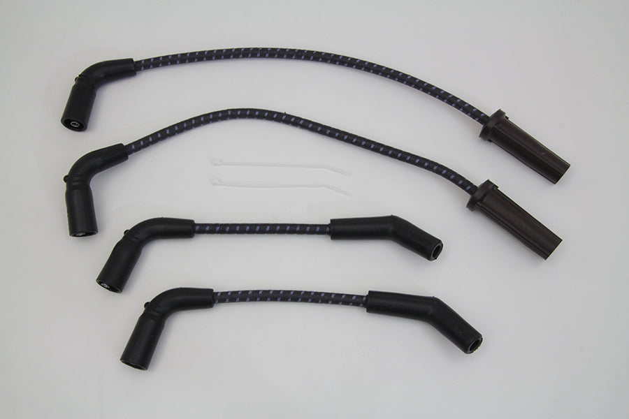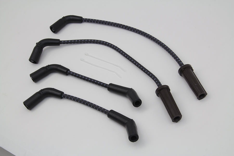 Sumax spark plug wire set is black with a blue tracer. A combination Kevlar Helically Spiral Wound Core at 350 ohm per foot resistance delivers greater spark energy while improving power idle and fuel efficiency. Cloth jacket is rated at 450°F and resists heat oil and abrasion. These wires will work on all models with point or electronic ignitions. Set includes 16 and 17 leads with 90° plug boots and 180° coil boots.