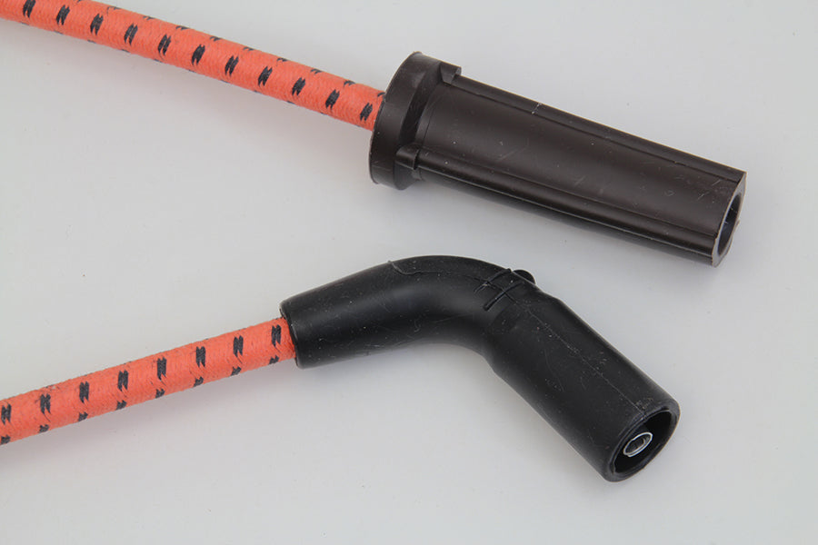 Sumax spark plug wire set is orange with black tracer. A combination Kevlar Helically Spiral Wound Core at 350 ohm per foot resistance delivers greater spark energy while improving power idle and fuel efficiency. Cloth jacket is rated at 450°F and resists heat oil and abrasion. These wires will work on all models with point or electronic ignitions. Set includes 16 & 17 leads with 90° plug boots and 180° coil boots.