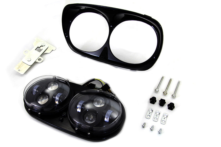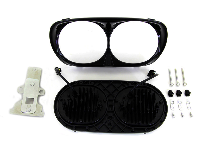 Dual unit includes two LED daylight headlamps mounted onto a backing plate for easy installation features a black finish housing with black shaded reflector. Assembly is complete for installation includes bracket and hardware.