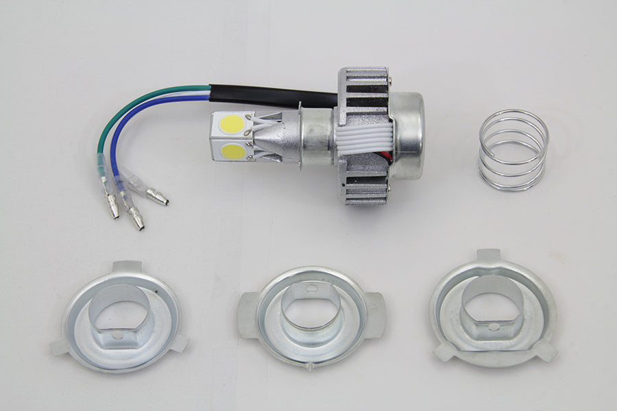 LED headlamp projector kit features heavy duty construction and bright white bulb for H4 replacement. Projector has a high beam 18W/1500lm and low beam 12W/1000LM beam function which performs better than a H4 bulb. Comes fitted with bullet connectors. Theblue wire is the hight light (+) green wire is GND (-) and the white wire is low light (+). These LED projector bulbs feature state of the art SMD technology and have a heavy duty construction with a high resistance to torsional frame vibrations. The high power patterned SMD type LED's provide maximum illumination.