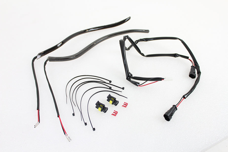 Fairing edge light kit adds forward-facing white LED accent lights to the front profile of your bike. Formed to follow the contour of the batwing fairing the slim strip of lamps adds a strong visual element to the shape. The electrifying appearance gets you noticed and the smoked housing conceals the lights and blends into the background when switched off. *NOTE: Simple plug in connections with no cutting or splicing of the wires required.