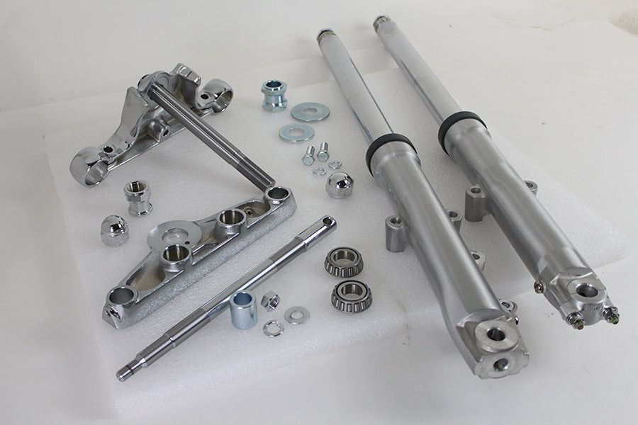 Wide glide fork assembly with polished sliders accept 11-1/2 single disc for 1952-1981 XL models. Fork assembly wide glide with polished sliders features wide style with triple trees axle neck bearings top cone and stem nut pinch bolts and bearing dust covers. Unit requires a Big Twin Wide Glide front wheel. Units do not include provision for fork locks. Accepts VT 36-0803 speedo drive kit. The length from the top of the fork tube to the center of the axle hole measures 31-5/8 .