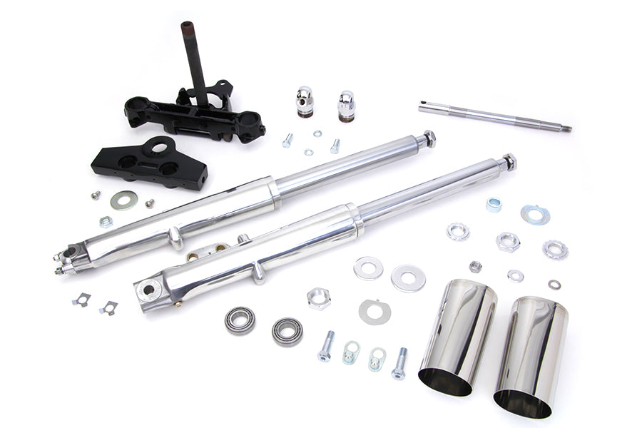 Hard chrome 41mm adjustable fork tube assembly with polished sliders includes black adjustable rake triple tree set. Includes polished sliders with the internals installed stainless slider covers axle and nut fork bearings and cone nut installed. Assembly is disc brake type. This assembly can also be used on 1971-1984 FX and 1948-1969 FL models.