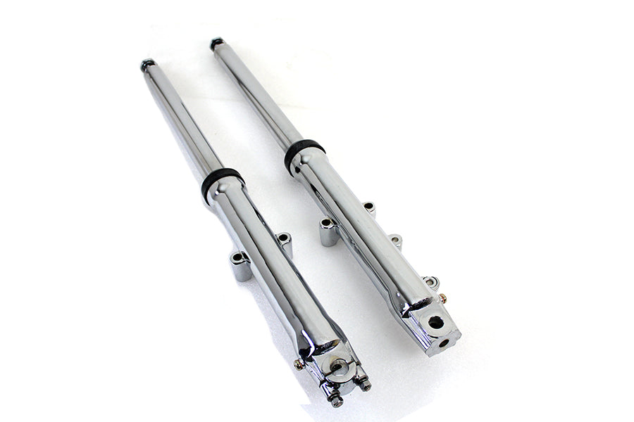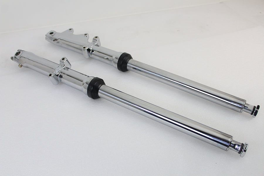 Assembly features chrome sliders with springs hard chrome fork tubes and components installed. Sliders are 2 over stock Assembly is for for 11-1/2 single disc application. The overall length from the center of the axle to the top of the leg measures 33 . Set of two.