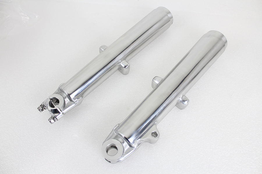 Polished right and left 41mm Glide fork slider set for the left side drum brake. Lower leg set accepts 1977-1984 type seals. The tube fits directly into the leg without bushings. *NOTE: Bushings included. Sold as set of two. *NOTE: Fork legs accept the later model double lip seal related seal washers and snap rings.