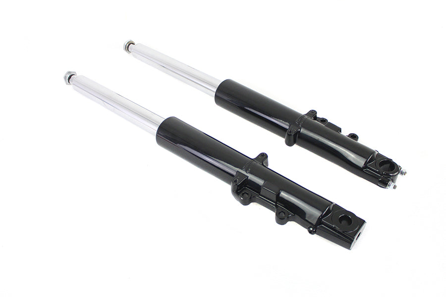 Assembly features black sliders with springs hard chrome fork tubes and components installed. Assembly has an overall length of 28-1/2 . Assembly is for dual disc applications fits 1 axle. Sold as a pair.