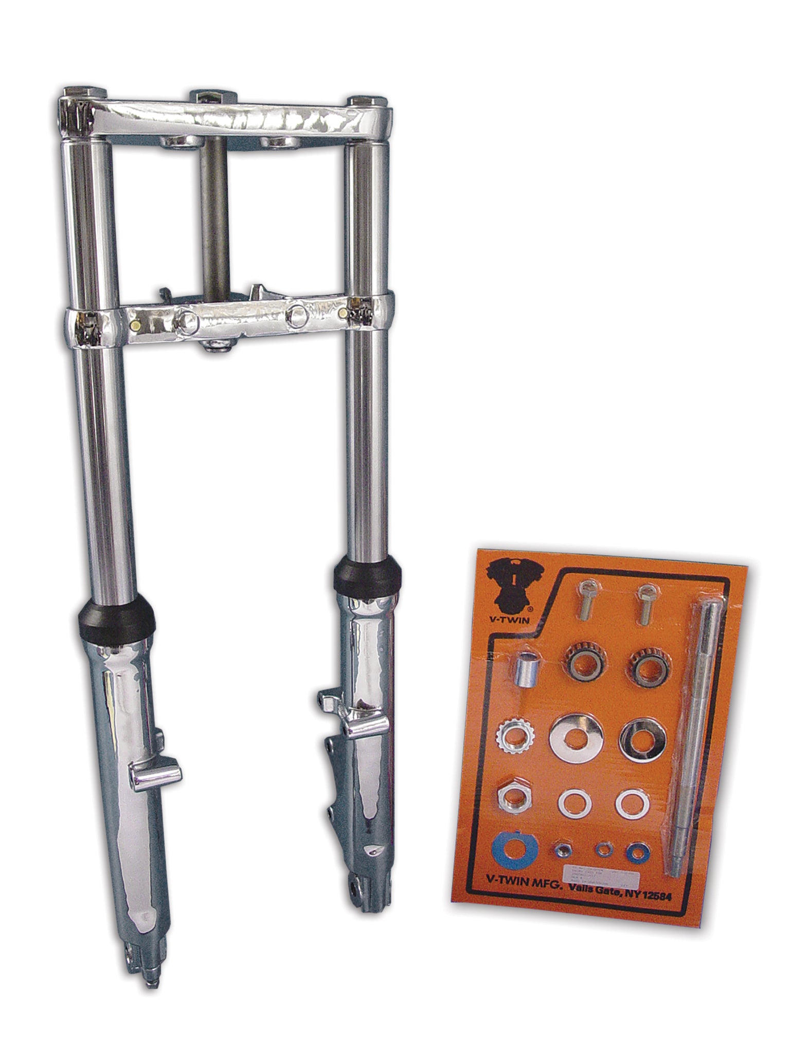 FXST style single disc fork assembly with chrome sliders for single disc applications. Includes chrome triple trees with 1 stem axle neck bearings top cone stem nut pinch bolts and dust covers. Overall length of leg assembly is 31 . Unit accepts 11-1/2 single disc left side caliper. This kit can also be used on 1948-1984 FL 1971-1984 FX and 1986-1999 FLST.
