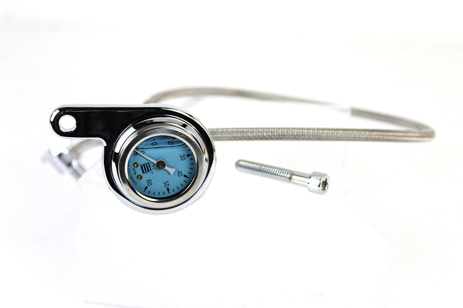 Rocker box oil pressure kit features 0-60lb liquid filled gauge indicator lamp switch chrome bracket and screw to mount to head and stainless steel line. *NOTE: The lens is acrylic.