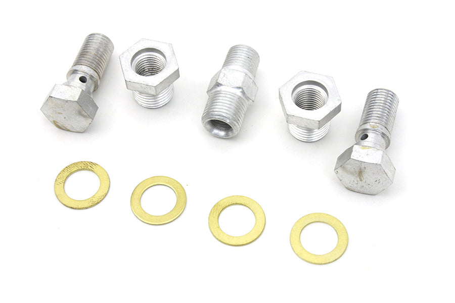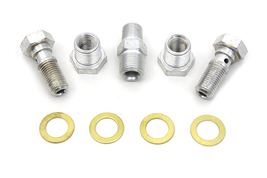 Oil line fitting kit with cadmium finish. This 9 piece kit includes 2 banjo bolts 4 washers 2 reducer sleeves and 1 nipple.