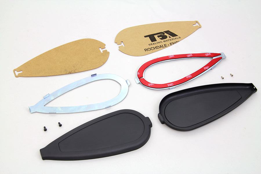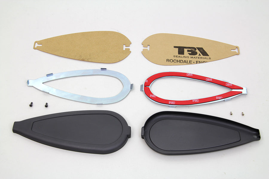 1940-46 tank emblem kit includes 2 parkerized tank emblems mount strip set gaskets and an Anderson and V-Twin patch. Originally offered by Anderson Motorcycle Supply of Los Angeles.