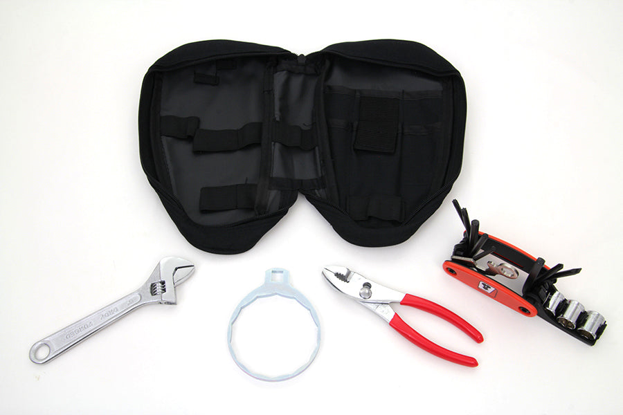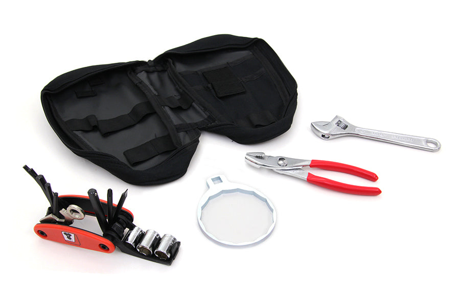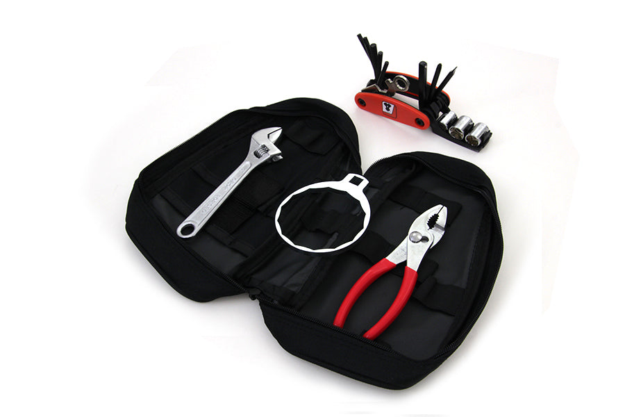 Rider tool kit fits into the included 7 x 2 blue zip-up pouch. 17 piece tool kit. NOTE: Entire kit will fit in oval kidney shaped tool boxes.