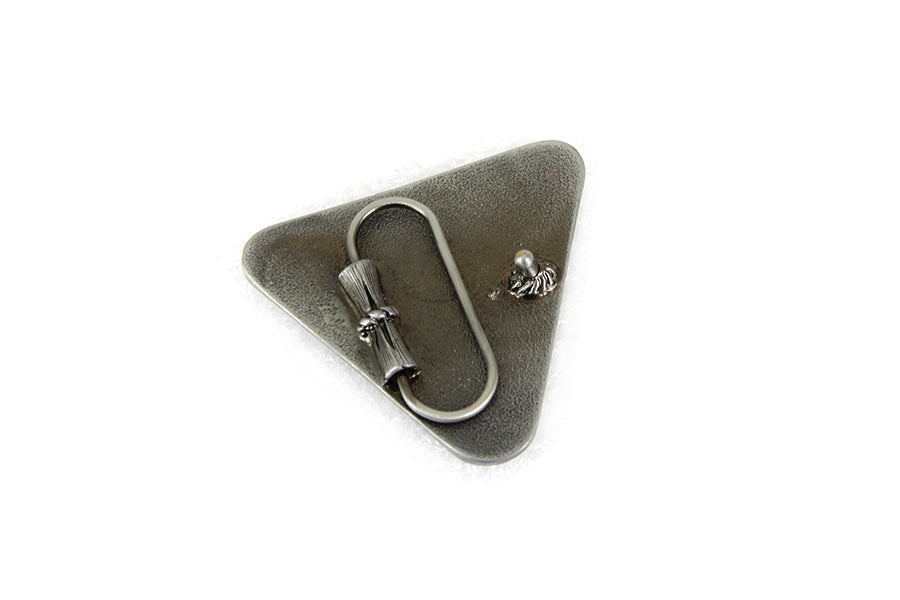Triangle shaped 3 belt buckle with silver patina finish. Reproduction of the original belt buckles of the 1980's and 1990's!