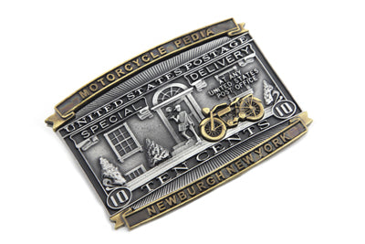 Postage belt buckle. Reproduction of the original belt buckles of the 1980's and 1990's! Includes a kick stand for display.