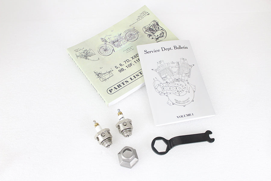 Doering 7/8 hex plugs with parts books for F and J models packed in a 5 gallon can. Includes the Factory Service Bulletin for 1912-1926 Big Twins and the Parts Bokk for 1909-1932 V-Twins.