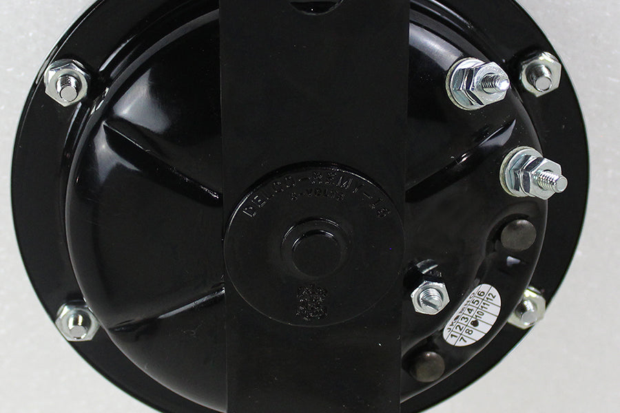 New Production replica early 6 volt horn features a chrome grill with the Delco logo and 8-32 NF threaded terminal studs. Horn is 6 bolt style. A rear strap bracket is attached with rivets and features four holes for mounting. The small holes measure 1-3/8 center to center. The large holes measure 5-1/4 center to center.