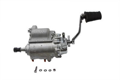 Replica 4-speed transmission is fully assembled. Replica 4-speed transmission is jockey type and includes original cast case with early style main drive gear 44 rollers and 2:1 ratio speedometer drive gear internal parts original style aluminum kicker cover and components clutch rod throwout bearing ratchet top with natural finish with chrome dust cover 1 piece chrome kick arm mount studs hub nut seal and key. Transmission comes fully assembled and has a 3.00 ratio FL style. This transmission is for kick starter only. No The roller bearings are caged in the countershaft gear but not in the main drive gear. *NOTE: Manufacturer's Statement of Origin required Bill of Sale only. *NOTE: This handshift transmission shifts 1-back and 3-forward. Transmission accepts 2:1 ration speedometer. *NOTE: All transmissions are fitted with a 22 tooth countershaft sprocket (V-Twin #19-0081). Various sizes available separately; 20 26mm tooth.