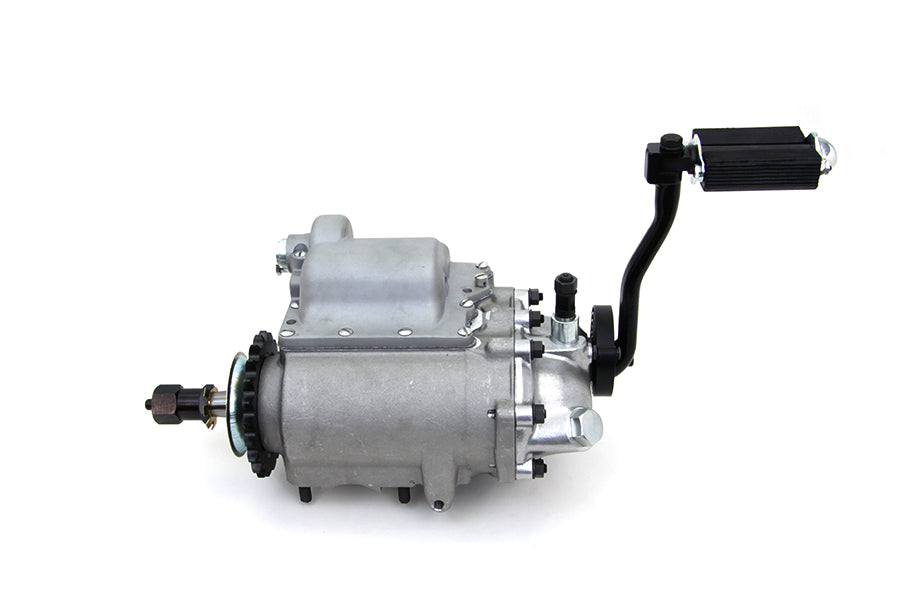 Replica 4-speed transmission is jockey type with kicker cover. Aluminum kick starter cover features a natural finish. Kicker arm and spring features a gloss black painted finish. Kit includes original cast case with early style main drive gear 44 rollers neutral switch 2:1 ratio speedometer drive gear internal parts original style aluminum kicker cover and components clutch rod throwout bearing ratchet top with natural finish with chrome dust cover one piece black kicker arm mount studs hub nut 23 tooth drive sprocket seal and key. Transmission comes fully assembled and has an FL style 3.00:1.00 first gear ratio.This transmission is kick starteronly. No Manufacturer's Statement of Origin required. Bill of Sale only. *NOTE: This handshift transmission shifts 1-back and 3-forward.