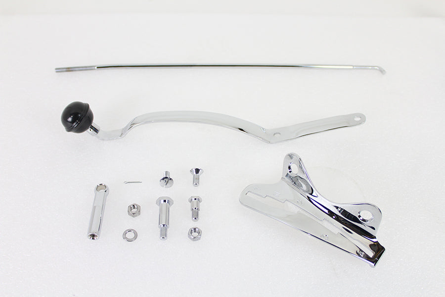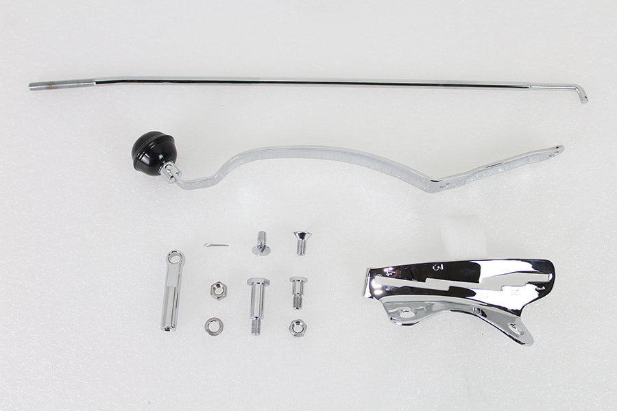 Chrome tank hand shifter lever control kit includes gate rod rod end pivot bolt and shifter lever for left side mounting. Shift pattern is front to rear.