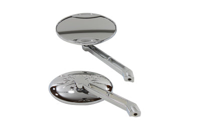 Chrome oval mirror set includes 5 billet stems. Set includes right and left sides.
