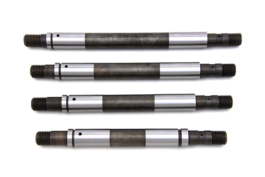 Knucklehead rocker arm shaft set features oil galley's milled into each shaft as required on the 1937 EL models with the tea cup type valve spring covers. Rocker arm shaft set is accurately reproduced after the original Knuckle motor of 1936. This set is shipped in an oil finish. Turn rocker shaft for alignment as required. This is a 4 piece set. *NOTE: Set will not accept V-Twin #11-1143 as rocker shaft is not threaded for the oval head screws. The bearing surface length on both ends are ground for rocker rotation. The front exhaust shaft is 5.280 front intake shaft is 4.095 rear intake shaft is 3.555 and the rear exhaust shaft is 4.645 .