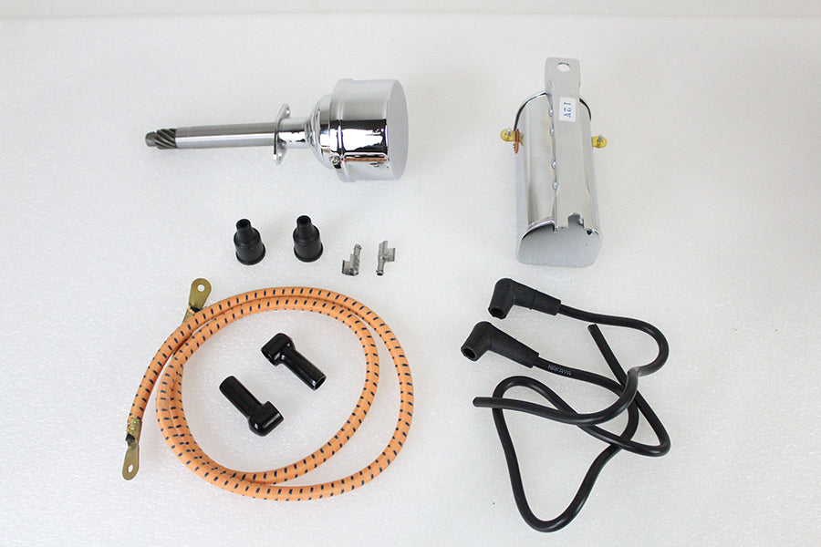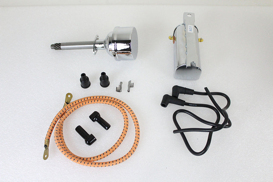 12 volt distributor and coil kit features a chrome automatic advance distributor a metal jacketed chrome coil and vintage wire set with boots *NOTE: Drilling a hole in the plate helps to set advance when timing.