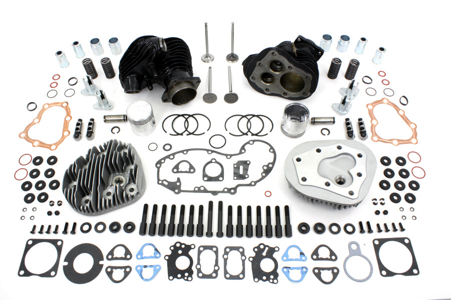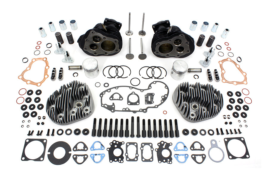 45 W Top end kit includes 45 valve cover kit 45 lifter kit valve spring kit front & rear 45 cylinder four sifton interchangeable intake/exhaust valves high compression head gasket kit headbolt kit and washer kit. *NOTE: Includes VT #11-0637 Piston Kit Standard with Hastings ring set. Barrels are pre-fit to accept these pistons. Check ring gap before final assembly.