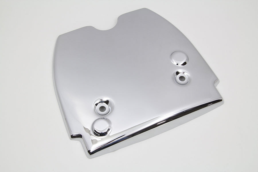 Battery top frame cover features a chrome finish and is for swingarm frame models. Mounts by attaching to battery rod top nuts on 6 volt models.