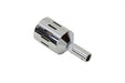 Chrome canister features enclosed breather filter and tube for attaching to breather cross-over lines held in place by screws. The bottom cover is removable for cleaning.