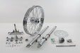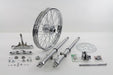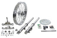 FXST style single disc 41mm fork assembly with polished sliders are assembled with internal components. Features a hard chrome fork assembly with polished sliders and chrome triple trees with 1 stem. Sliders come without reflector boss and internals installed. Leg assembly is stock length 31 overall. Kit also includes axle neck bearings top cone stem nut pinch bolts and dust covers. 21 chrome assembled wheel with bearings 11-1/2 drilled disc with chrome screws and a chrome left side caliper with mount hardware pads and pistons assembled are included. This assembly can also be used on 1948-1984 FL 1971-1984 Fx and 1986-1999 FLST.