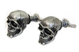 Bolts with skull design for mounting on license plates featuring a silver patina finish and will work on most flat surfaces.