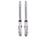 Dual disc assembly features chrome sliders with springs hard chrome fork tubes and components. Assembly is for 11 dual disc application and fits a 3/4 axle. This assembly can also be used on 1948-1984 FL 1971-1984 FX 1986-1999 FLST 1984-1999 FXST and all billet or stock type 41mm triple trees. Sold as a pair. Fork slider assembly is 32-3/4 to center axle and mount holes measure 3-1/2 center to center. Top fork plug measures 0.989 in diameter.