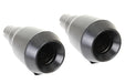 Grenade muffler set features a 2-1/4 inner diameter inlet with a black finish. Has a channel mount to accept T bolts for mounting. Sold as a pair. *NOTE: Must order clamps to secure both mufflers to each other and to a rigid portion of the frame. Installer must fabricate the brackets. *NOTE: Order bolt set separately.