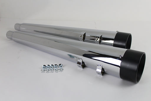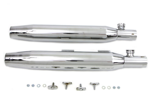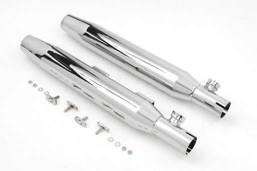 V-TWIN MANUFACTURINGIn stockTapered muffler set with slotted track chrome end clamps and strap mounting features a chrome finish. Set has baffles but are not removeable. Muff...