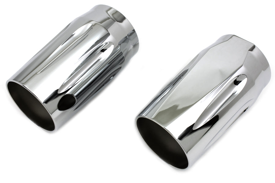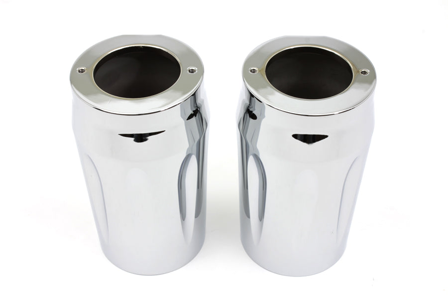 Upper fork slider cover set features an edge cut design and a chrome finish with milled accents. Attach using 10/24 x 1-5/8 hex flange screw (OEM #10200042).
