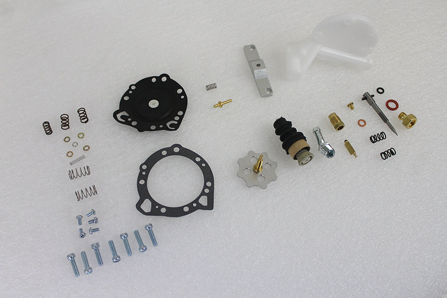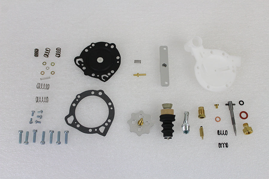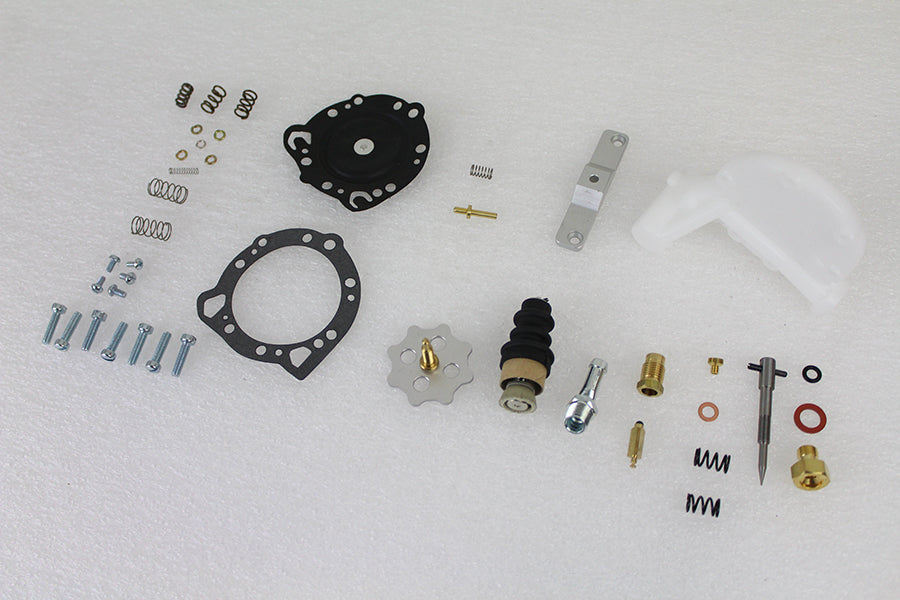 Tillotson carburetor parts kit includes the fuel inlet adjustable needle kit tickler kit idle mixture screw base pump needle and seat gasket and hardware kit. Kit is for use with Tillotson carburetors only. Parts are packaged inside a V-Twin decorative tin.